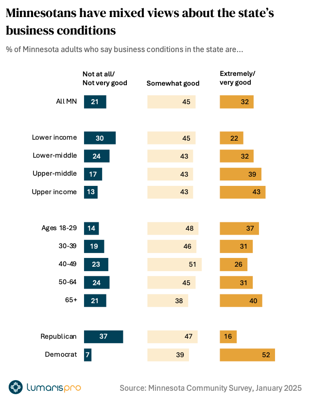 Views on business conditions in Minnesota varied widely by party, and to a lesser extent, by income, according to a Minnesota Community Survey of 1,477 adults conducted Dec. 4, 2024 to Jan. 20, 2025.