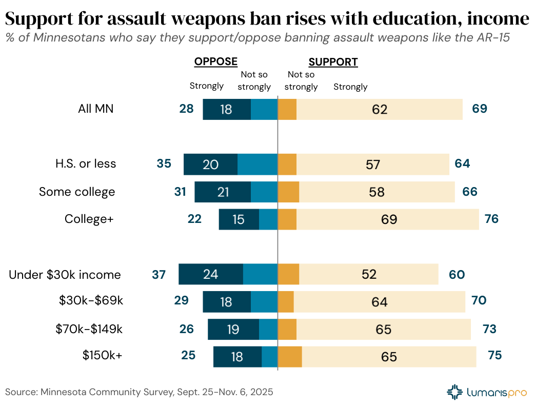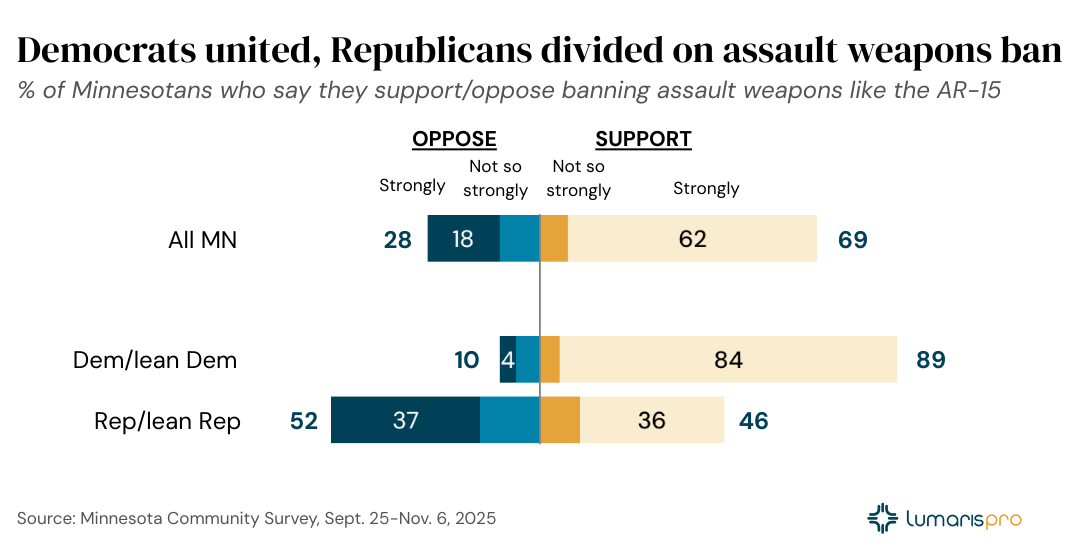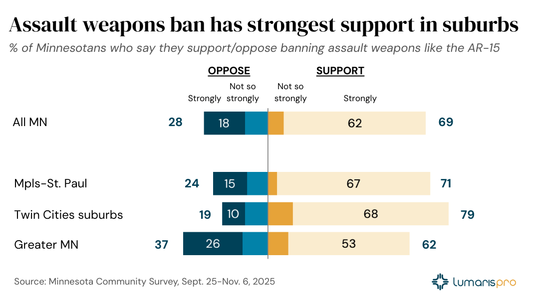 More than two-thirds of Minnesotans (69%) support banning the sale of assault-style weapons such as the AR-15, but the most striking finding may be where support runs highest, according to a Minnesota Community Survey of 1,172 adults conducted Sept. 25–Nov. 6, 2025.