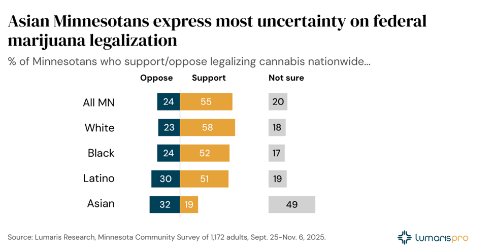Asian Minnesotans stand out for uncertainty rather than opposition. Nearly half chose "not sure" on legalization, more than double the statewide rate. Foreign-born residents show a similar pattern.
